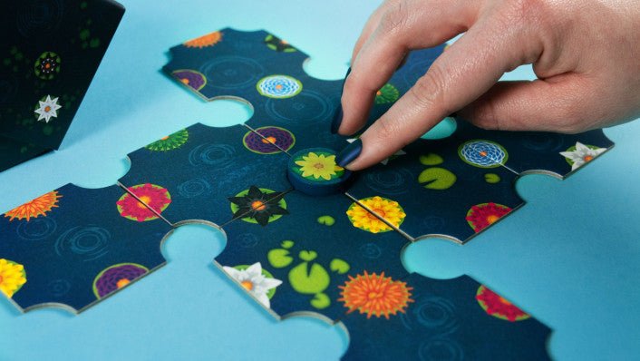 Place each new tile you draw next to a tile already in play, making sure to match the colors of all the tile edges touching the tile you are placing. Each time you manage to complete a square of four touching tiles, a blossom opens between them.