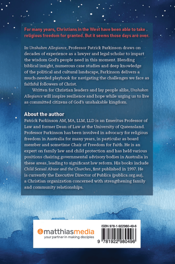 In Unshaken Allegiance, Professor Patrick Parkinson draws on decades of experience as a lawyer and legal scholar to impart the wisdom God’s people need in this moment. Blending biblical insight, numerous case studies and deep knowledge of the political and cultural landscape, Parkinson delivers a much-needed playbook for navigating the challenges we face as faithful followers of Christ.